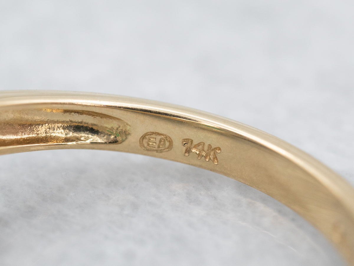 A classic halo ring with a twist! The diamonds that surround the emerald are cut into both baguette and round shapes, creating a distinctly modern array! The slight curve of the band adds elegance and great design appeal. The emerald itself is a gorgeous bright Kelly green!