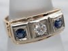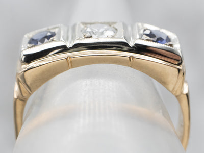 This sleek retro-era ring is a true classic! Set low to the hand with flush-mounted stones, this would suit well as a piece to be worn every day! We love the substantial look of the two-tone gold combined with the glittering, high-quality diamond and sparkling sapphires.