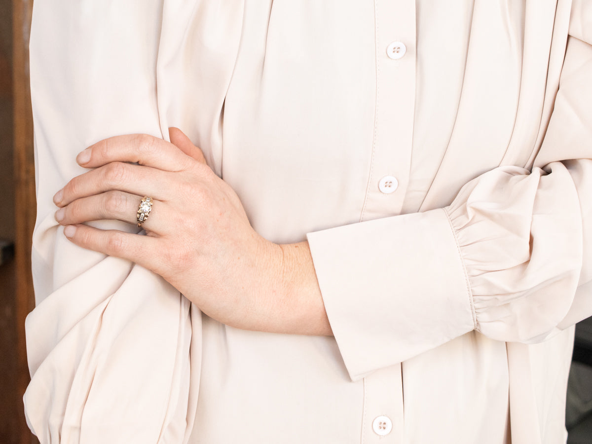 What a beauty! A round diamond sits in its center glowing with bright, full light from the wide facets. This is a beautiful, feminine ring! The four diamond accents are set in white gold providing an illusion of even larger diamonds.