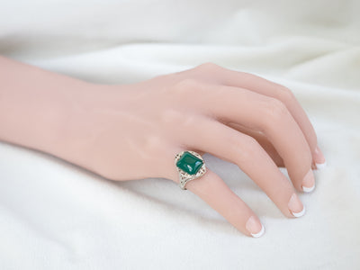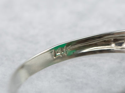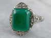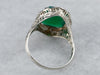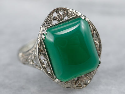 This sweet and dainty white gold filigree mounting is lovely! Wonderful pierced cut-outs and floral designs in the curling filigree give the mounting amazing visual interest, and the classic green onyx center is a unique complement to the white gold.