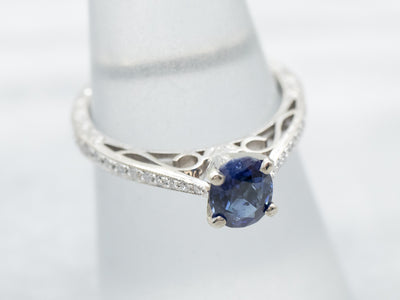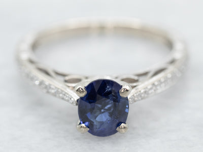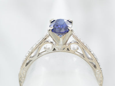 Balanced on the hand and substantial without being overwhelming, this is a favorite style of setting for engagement rings! This engraved diamond studded engagement ring with a beautiful sapphire, color is deep, navy blue, with bright sparks of the sky and cerulean radiating from the polished facets!