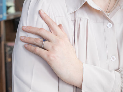 Metal: 14K White Gold Gem: Sapphire totaling .88 Carats Gem Measurements: 6.5 x 5.2 mm, Oval Accents: 20 Diamonds totaling .12 Carats, VS-SI in Clarity, G-H in Color Ring Size: 6.75 Marks: “14K SHANE CO” Stamped on the inside band