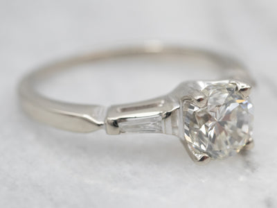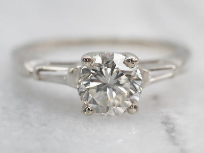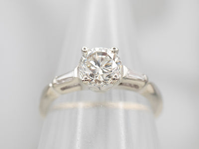 A classic engagement ring with timeless details. This white gold mounting is well proportioned, with simple lines. The center stone is a beautiful brilliant cut diamond weighing in at 1.03 carats, bright and lovely with stunning color and clarity. Tapered baguette diamonds accent each shoulder adding to the grace and style of this classic engagement piece!
