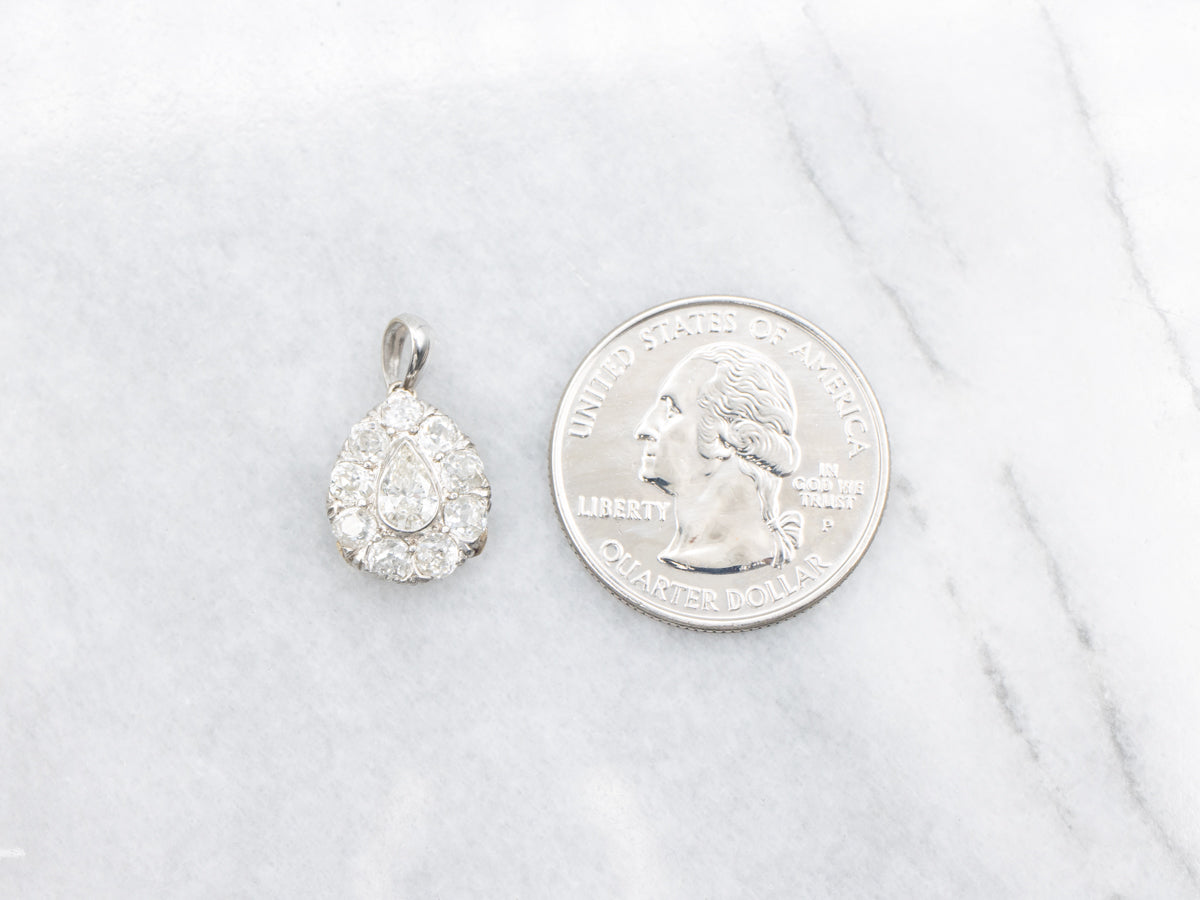 Metal: 4K White Gold Gem: Diamond .39 Carats, SI2 in Clarity, J in Color Gem Measurements: 5.6 x 4.1 mm, Pear Cut Accents: 9 Diamonds totaling 1.20 Carats, VS-SI in Clarity, G-K in Color Measurements: 20 x 11 mm, with bail