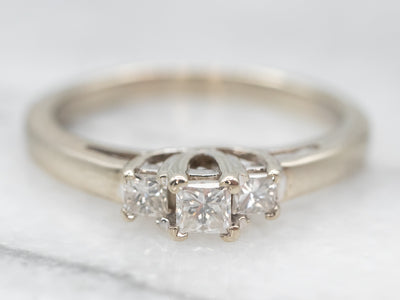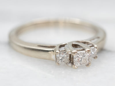 Metal: 14K White Gold Gem: Diamond .12 Carats, VS2 in Clarity, H in Color Gem Measurements: 2.7 mm, Princess Cut Accents: 2 Diamonds totaling .13 Carats, SI2 in Clarity, G-H in Color Ring Size: 5.75 Marks: "14K" Stamped on the inside band