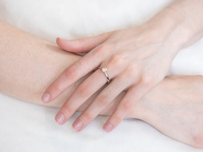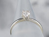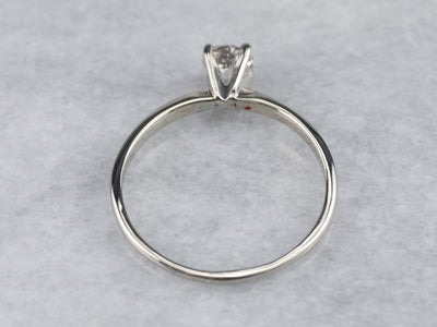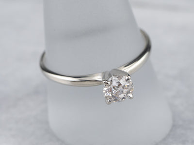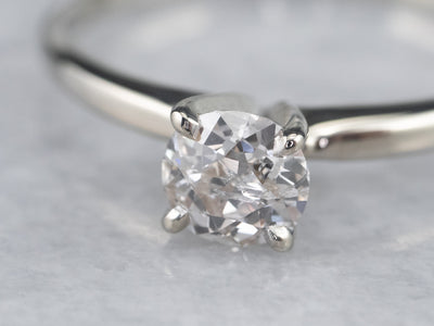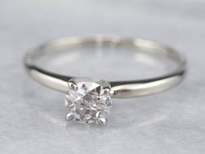 A simple solitaire engagement ring in bright white gold! Four prongs surround and secure the diamond beautifully! The center stone is a European cut stone which means that it was cut between 1880-1920. The only difference that separates a European cut and an old mine cut is that the European cut was a cut a little later and is more perfectly round in comparison to an old mine cut which is slightly cushioned. This spectacular diamond weighs .65 carats and features a flash and fire more modern cuts just can't match!