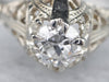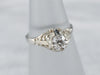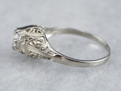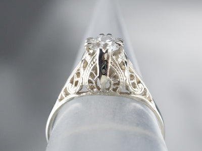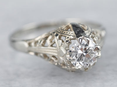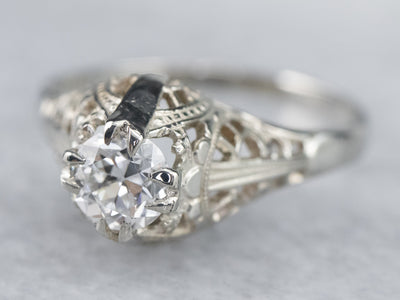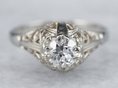 This lovely diamond flashes with warm light and shines from every direction. It's like wearing a little candle on your finger! This engagement ring is stunning and classic art deco, with a gently tapered shank and etched shoulders, and a perfectly balanced silhouette. A classic filigree head holds the diamond and gently transitions into a sleek and beautifully polished white gold shank! Timeless and elegant!