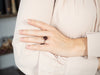 This ring features a simple and classically designed mounting, with a little bit of a twist! The scrolling pattern of the undercarriage lends a sense of light and grace to the mounting. Shaped in a perfect oval cut, the deep red garnet in the center adds a lovely pop of color and also an interesting shape to a simple ring!