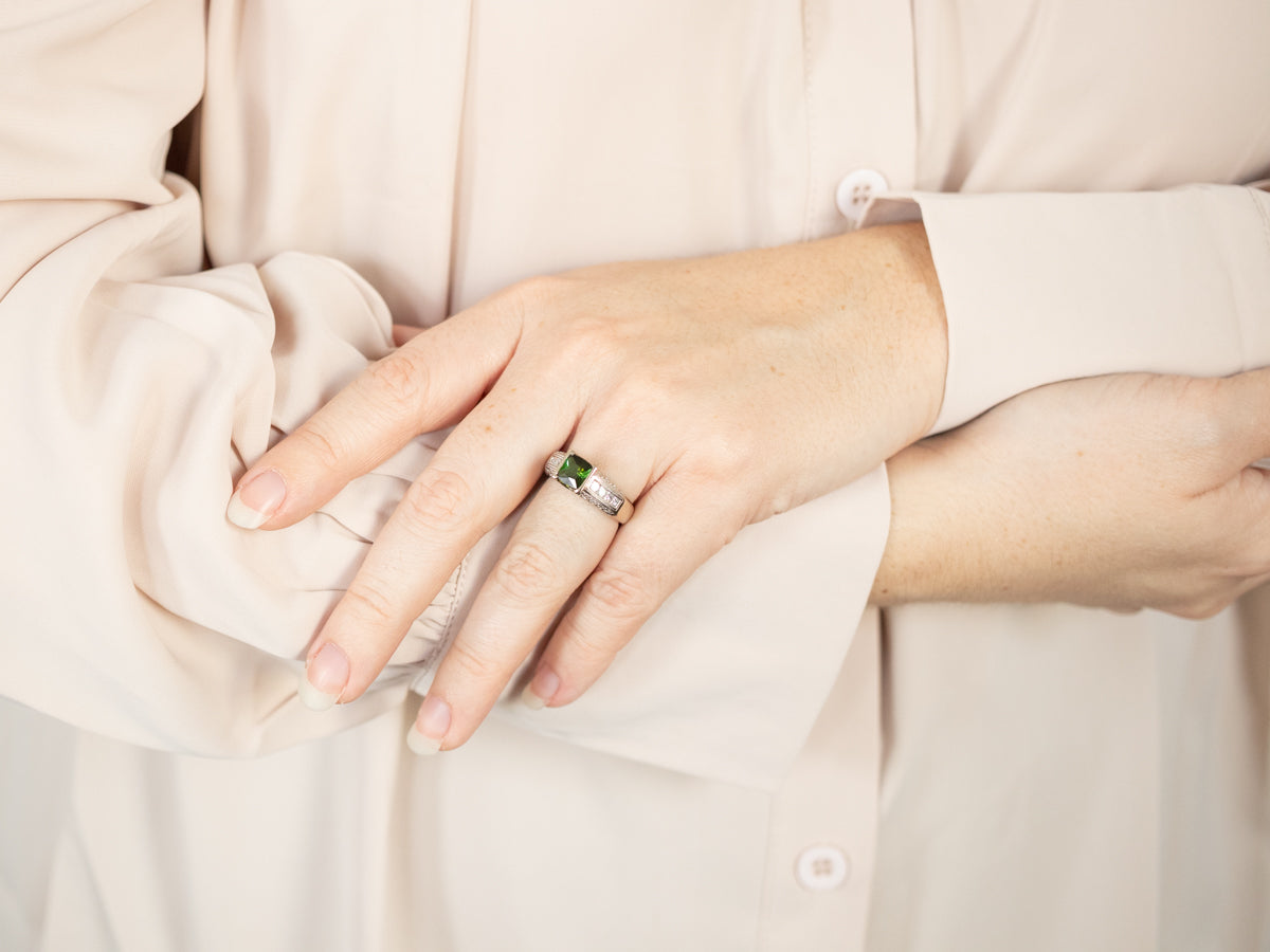 An elegant and timeless style, this stunning ring features a bright green tourmaline set in the center, flanked by diamonds on each side to add glamour and sparkle. We chose this deep, brightly colored stone from our Brazilian collection. Milgrain etching frames these twinkling diamonds, providing a gorgeous finishing touch!