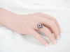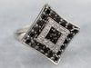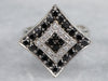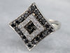 Contemporary and sparkling, this diamond cluster ring features a sophisticated mix of black and white diamonds. Lightweight and comfortable, this piece would make a great everyday ring, low set to the hand, and easy to wear!