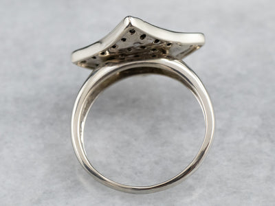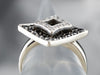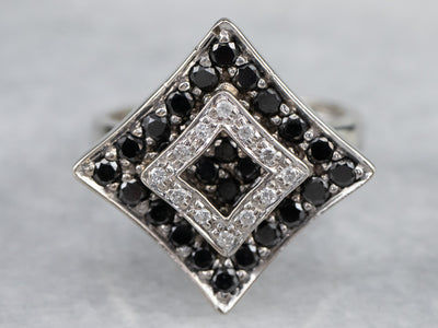 Metal: 14K White Gold Gem: 12 Diamonds totaling .06 Carats, I1 in Clarity, H in Color Gem Measurements: 1.1 mm, Round Accents: 36 Black Diamonds totaling 1.35 Carats Ring Size: 6.25 Marks: “14K” Stamped on the inside band