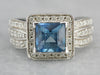 Material: 14K White Gold Stone: Blue Topaz 2.80 Carats, 7.0 x 7.9 mm, Square Cut Accents: 44 Diamonds totaling .44 Carats Size of Ring: 7 Marks: "14KT" Stamped on inside band