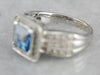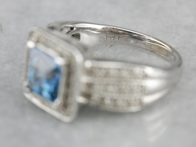 This ring is bold! Made from 14 karat white gold, the setting features a square center mount with bowed and tapered white gold sides. This ring has a wide profile on the finger, and the tapering and softness of the pave set diamonds almost give it a fluid look on the finger, as if it were constructed from fabric! A square cut center Blue Topaz is held by corner prongs, and surround by a halo of pave set diamonds, which also continue in three rows down the band. The bridge of the ring has little leaf shaped cut-outs to let light in underneath the center diamond.