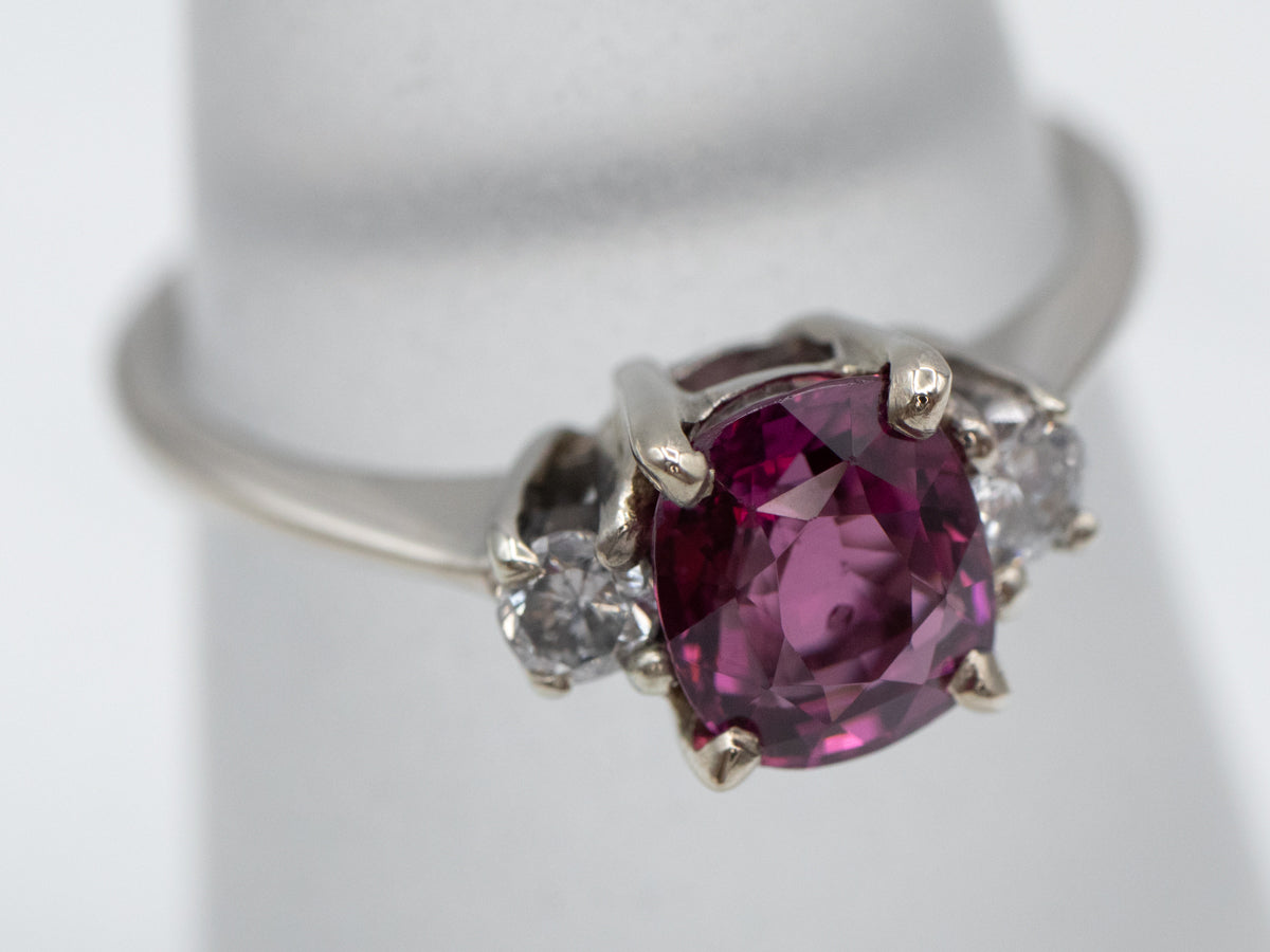This fabulous sweet pink sapphire and diamond ring has some very attractive features. The center's cushion-cut sapphire explodes with radiant pink fire. Two round cut diamonds compliment the center stone with bright white color and brilliant scintillation. Sleek four prongs hold each stone securely in place while also allowing plenty of light to illuminate them. This is an ideal ring for everyday wear, as a special cocktail ring to pair with a matching dress or outfit, or even as an alternative to a traditional engagement ring!