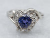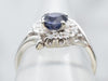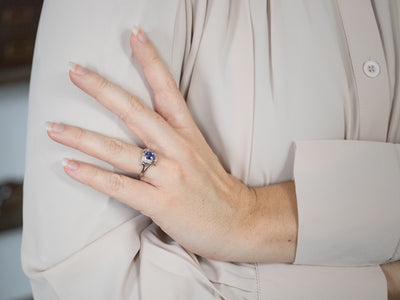 This sapphire, with its periwinkle hue and a lovely shade of violet-blue, is one of the prettiest in our collection! This gorgeous gem is framed to perfection by a 14-karat white gold mounting, scrolling and ornate, and positively stunning!