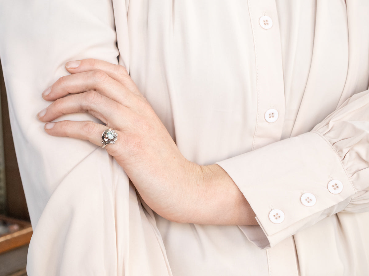 This retro-style bypass-style white gold setting has been set with a stunning blue zircon center, an icy gemstone, with shades of teal and cornflower color. The four-prong setting allows lots of light in and highlights the fire in this gemstone! This blue zircon is the perfect complement to the polished, white gold of this diamond setting.