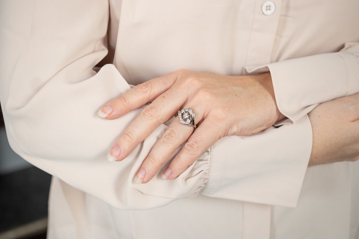 A beautiful sparkling diamond adorns the center of this fantastic 1950s cocktail ring! The center diamond is surrounded by sweeping ribbons, connected by a swirling tapered metal design engraved with retro motifs, which gives the ring almost a sense of movement! With lovely little cut-outs in between the designs and plenty of sparkles, this definitely makes for one unique and beautiful cocktail ring!