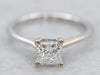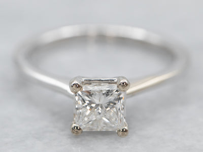 This diamond solitaire ring is sleek and classic! The diamond is a square princess cut with tremendous sparkle, neatly protected with a simple four-prong setting. This white gold mounting lifts the diamond in a high profile and lets plenty of light flow throughout.