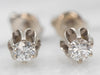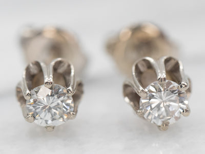 14k White Gold vintage solitaire stud earrings with buttercup mounting and prong set, diamond round center stone with post findings.