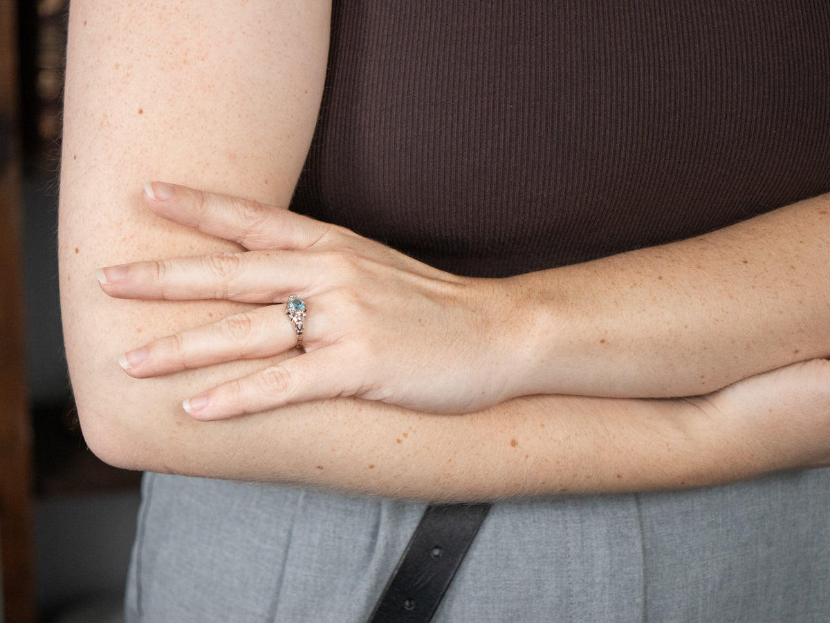 This bright, teal-hued shade of this zircon is perfect, and the faceting work done to bring out the sparkle is incredible! The workmanship that went into cutting this zircon truly brings out the stone's double refraction. We've set this blue zircon into a vintage setting, a white gold solitaire ring, we adore the decorative scrolling filigree, truly stunning!