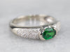Metal: 14K White Gold Gem: Tsavorite Garnet .60 Carats Gem Measurements: 5.8 x 4.4 mm, Oval Accents: 30 Diamonds totaling .09 Carats, SI1 in Clarity, G in Color Ring Size: 6.75 Marks: “14K KA” Stamped on the inside band