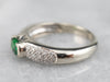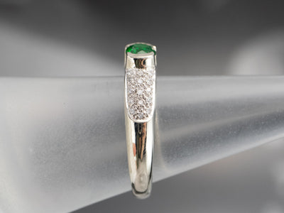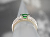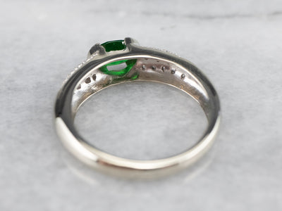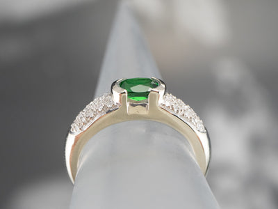 Timeless in style, rings such as this one can be worn as engagement rings, birthstone rings, or just for special occasions. We've set the center of this one with a pretty, glowing green tsavorite garnet. The side stones are bright white diamonds, reflecting plenty of light into the brilliant green center in their polished white gold setting.