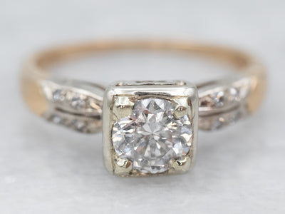 This vintage diamond engagement ring has wonderful small details that complement its overall structural feel. The shoulders are set with sparkling diamonds. This 14-karat white gold head and shoulders do double duty, both providing an illusion of larger diamonds and holding it securely in place. Feminine yet sophisticated, this will make a lovely heirloom place for years to come.