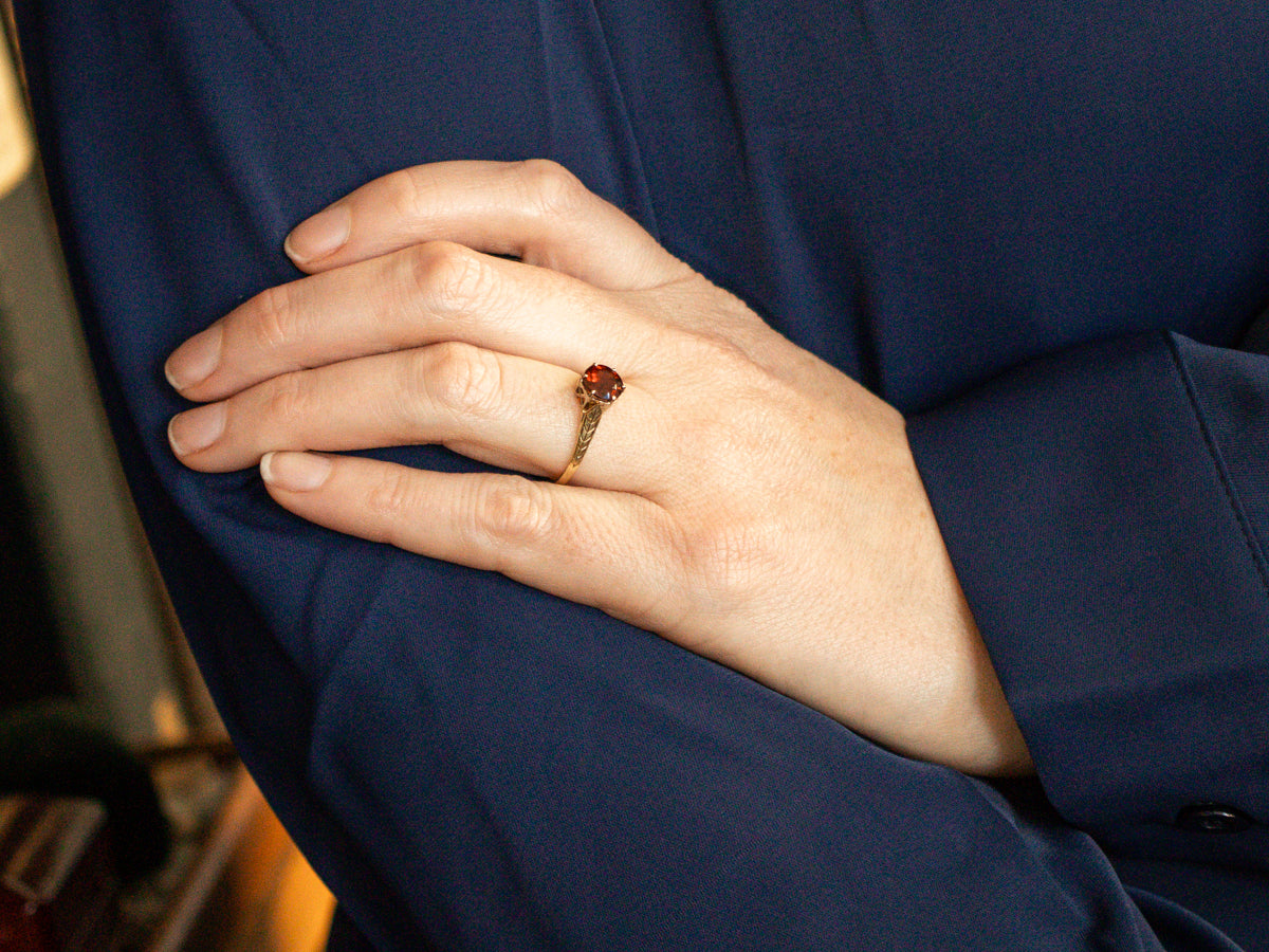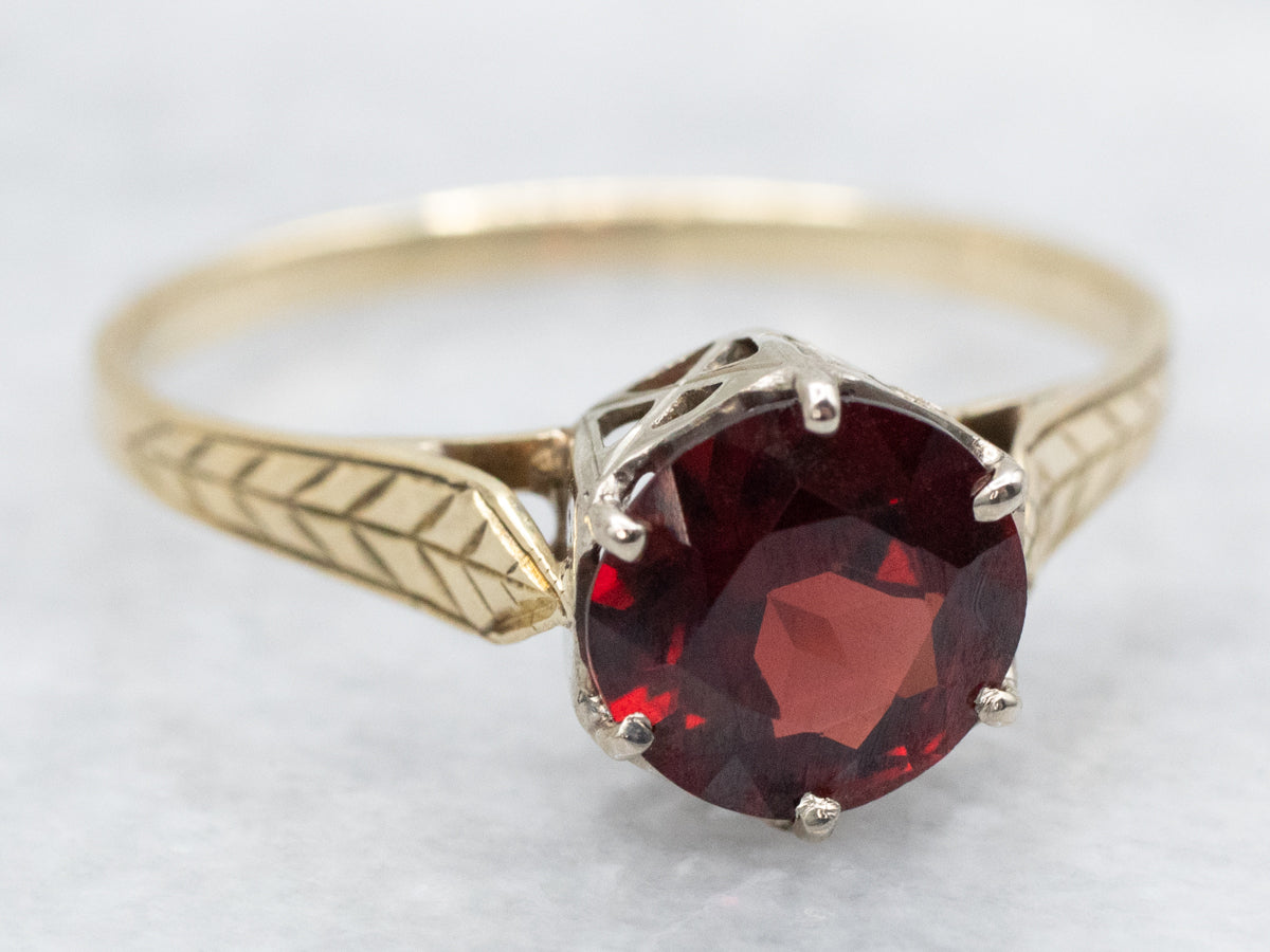 This mounting is genuinely beautiful. It has elements of the Art Deco period and the Art Nouveau period, and it's a perfect solitaire piece. The etched two-toned gold compliments the bright, deeply romantic garnet we've perfectly set in its center!