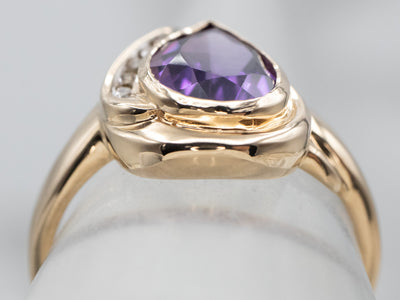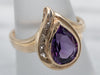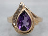 Metal: 14K Yellow Gold Gem: Amethyst 1.70 Carats Gem Measurements: 9.4 x 6.7 mm, Pear Accents: 5 Diamonds totaling .08 Carats, SI in Clarity, Champagne in Color Ring Size: 6.75 Marks: “14K” Stamped on the inside band