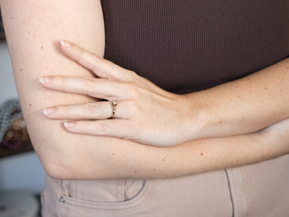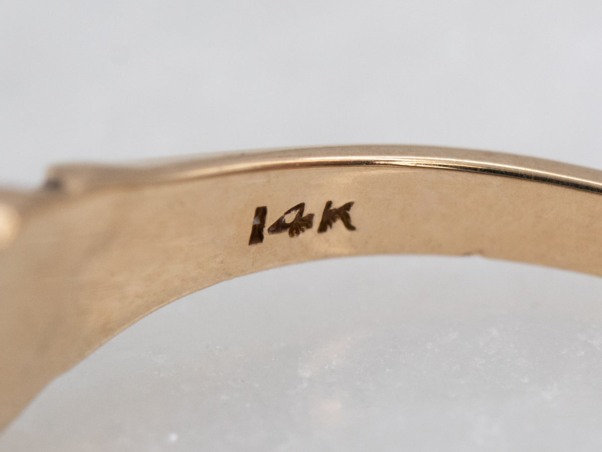 Metal: 14K Antique Rose Gold Gem: Old European Cut Diamond .12 Carats, VS2 in Clarity, J in Color Gem Measurements: 2.8 mm, Round Ring Size: 4.75 Marks: “14K” Stamped on the inside band