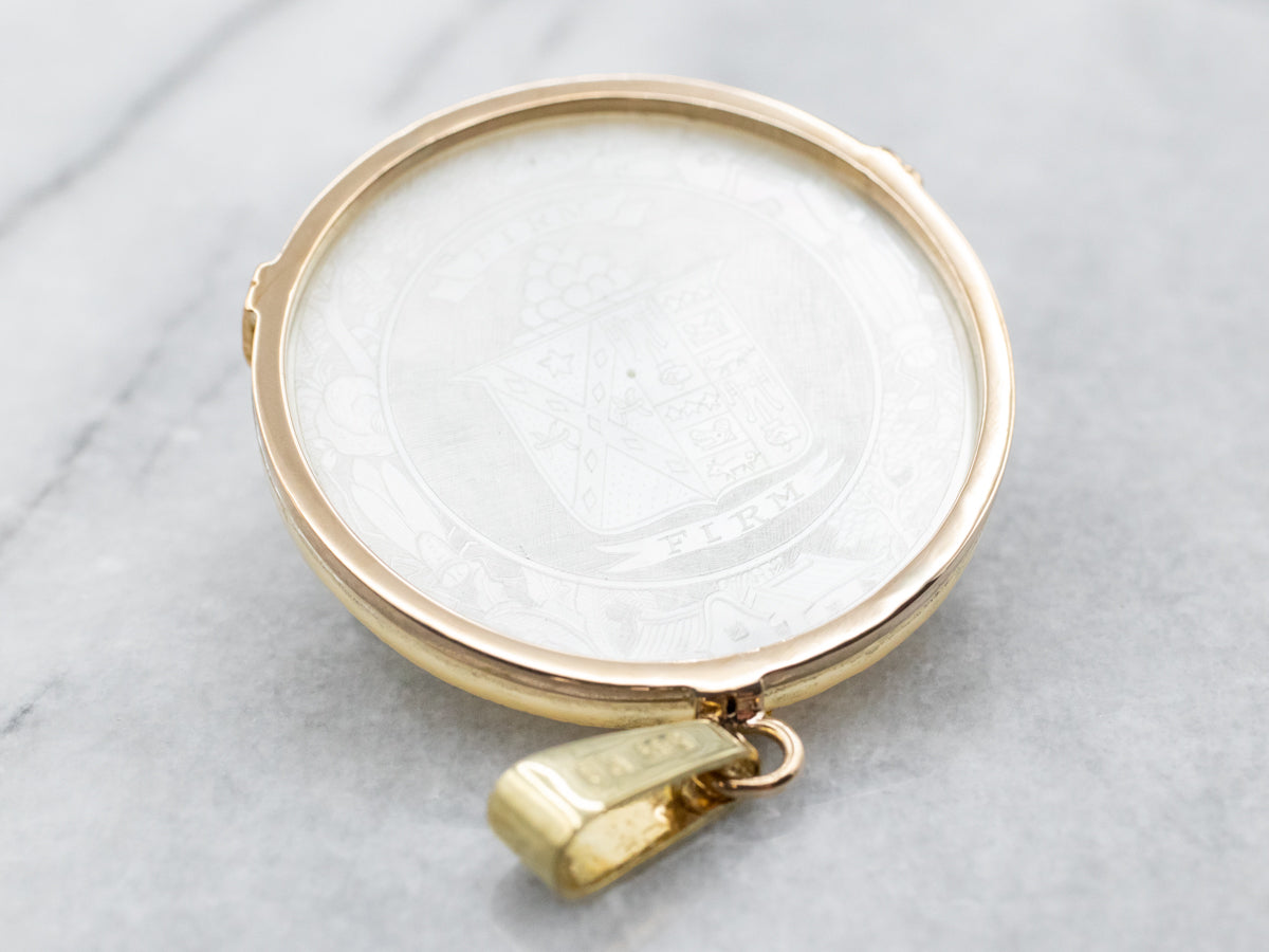 Metal: 14K Yellow Gold Gem: Carved Mother of Pearl Gem Measurements: 37.1 mm, Round Measurements: 53 x 37 mm, with bail Marks: “585 RB” Stamped on the reverse
