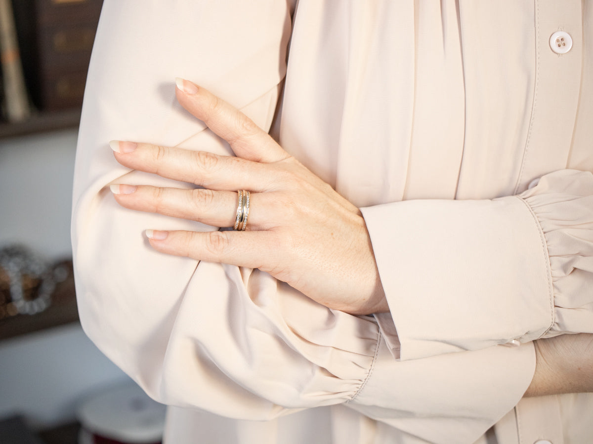 Metal: 14K Yellow and White Gold Gem: 84 Diamonds totaling .92 Carats, SI in Clarity, H in Color Width of Band: 6.3 mm Height off Finger: 2.4 mm Ring Size: 7 Marks: “14K” Stamped on the inside band