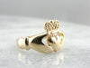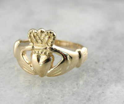 Traditionally the hands represent friendship, the heart is for love, and the crown is for loyalty. These three elements combined create the Claddagh, which is as much a symbol of Ireland as it is of love. These classic rings can be worn by a man or a woman. Worn on the right hand, with the point of the heart towards the fingers, it indicates that the wearer is single. With the point facing the body, it indicates that the wearer is in love. The left hand, with the heart toward the fingers, means that the wearer is engaged, but facing the body means the person is married. These are just guidelines, of course, and recent ones at that. We hope that you'll wear your Claddagh however you feel most comfortable doing so, representing your love for Ireland, for your betrothed, or just for beautiful, classic jewelry!