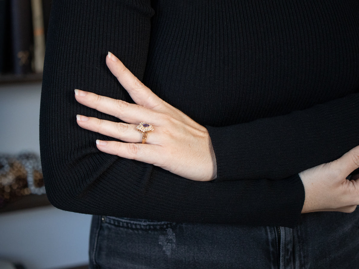 This beautiful yellow-gold diamond halo mounting has been set with a stunning tanzanite gemstone! The halo style is pretty, both framing and protecting the stone. This is one of our finest tanzanites, a natural stone, periwinkle blue, with fine, bright highlights. Outstanding in quality and construction, wearable and versatile, this is one of our favorite cluster rings!