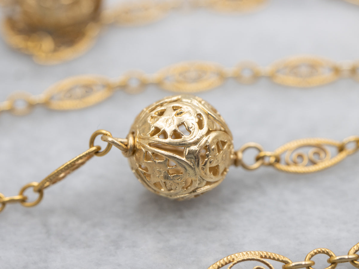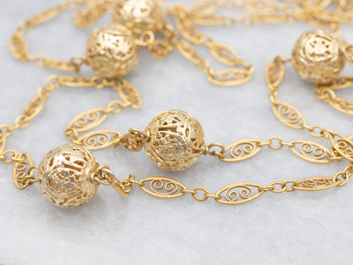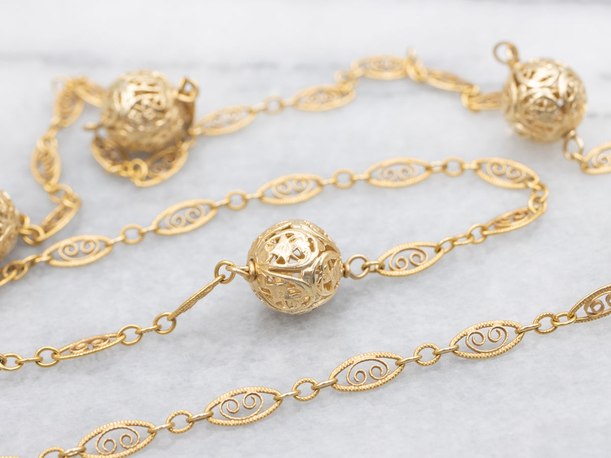 Elevate your elegance with this vintage filigree station chain necklace. This exquisite piece features delicately crafted gold filigree orbs spaced evenly along a refined chain, creating a timeless and sophisticated look. Perfect for layering or wearing alone, it adds a subtle touch of vintage charm to any outfit. Designed to complement both casual and formal styles, this necklace is a versatile addition to your jewelry collection that embodies grace and enduring beauty.