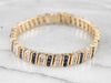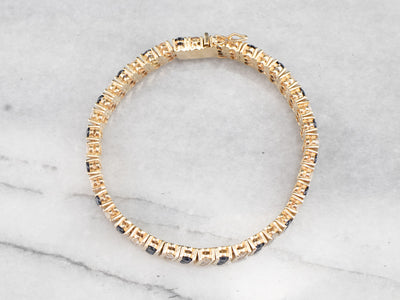 Metal: 14K Yellow Gold Gem: 60 Diamonds totaling 4.20 Carats, H in Color, SI2 in Clarity, 60 Sapphires totaling 4.20 Carats Gem Measurements: 2.5 mm, Round Width: 7.0 mm Length: 7 Inches Marks: “14K” Stamped on the clasp