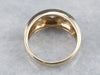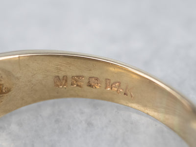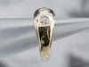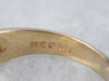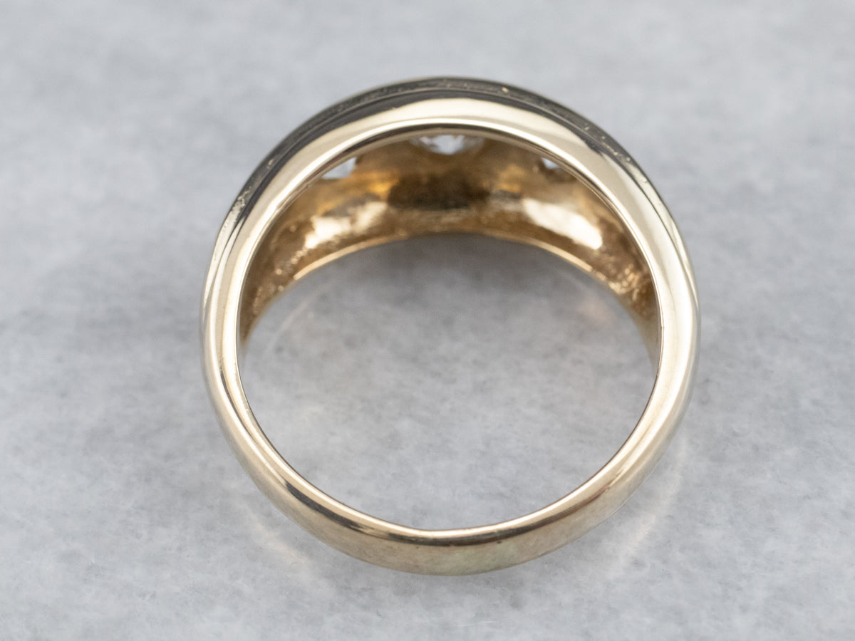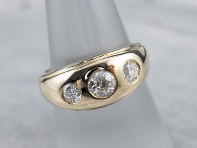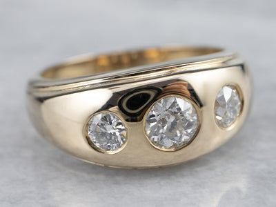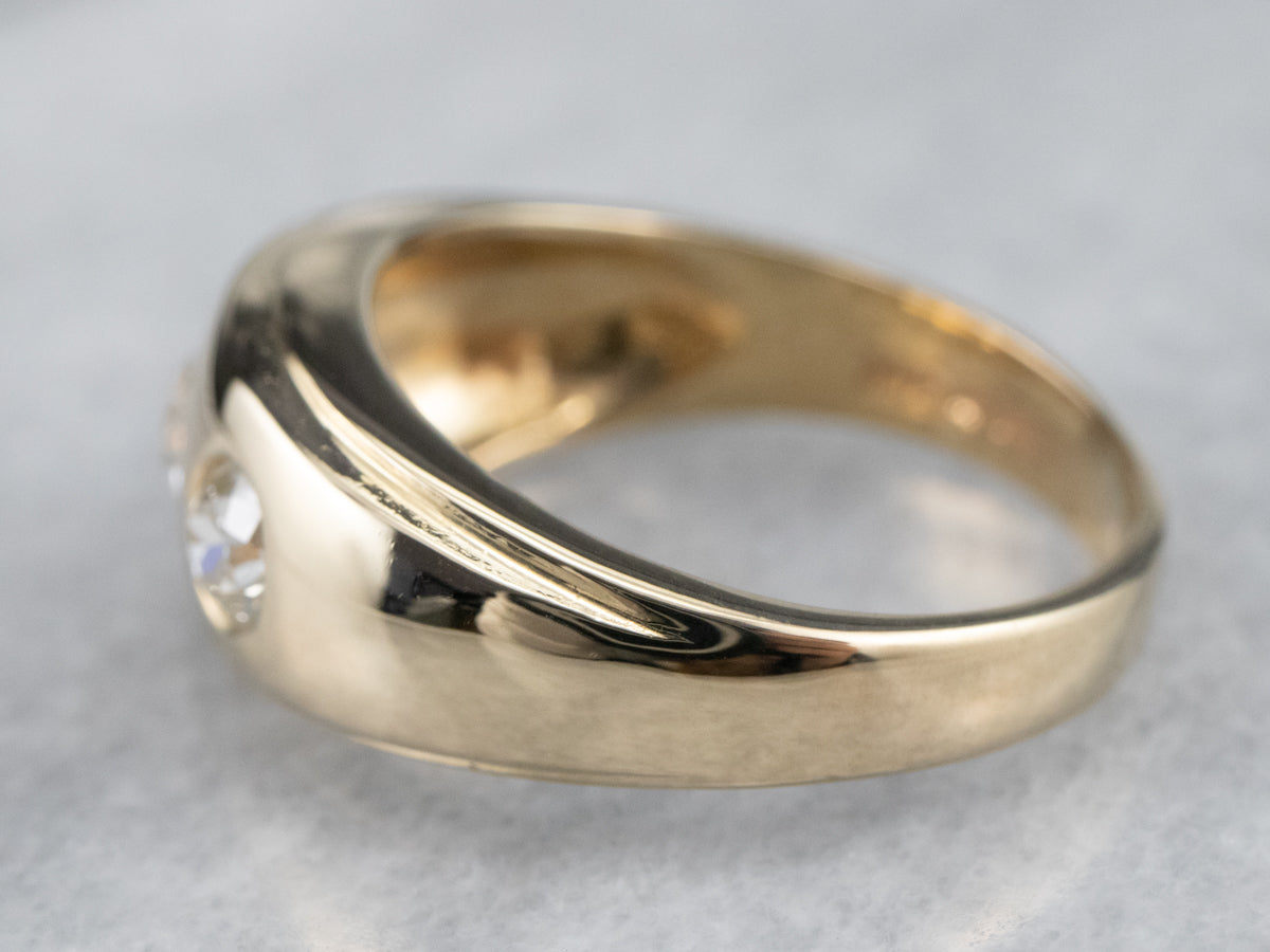 Metal: 14K Yellow Gold Gem: Old European Cut Diamond .60 Carats, SI1 in Clarity, H in Color Accents: 2 Old European Cut Diamonds totaling .52 Carats, VS2 in Clarity, H in Color Width of Band: 9.8 mm Height off Finger: 4.9 mm Ring Size: 8.75 Marks: “MED 14K” Stamped on the inside band