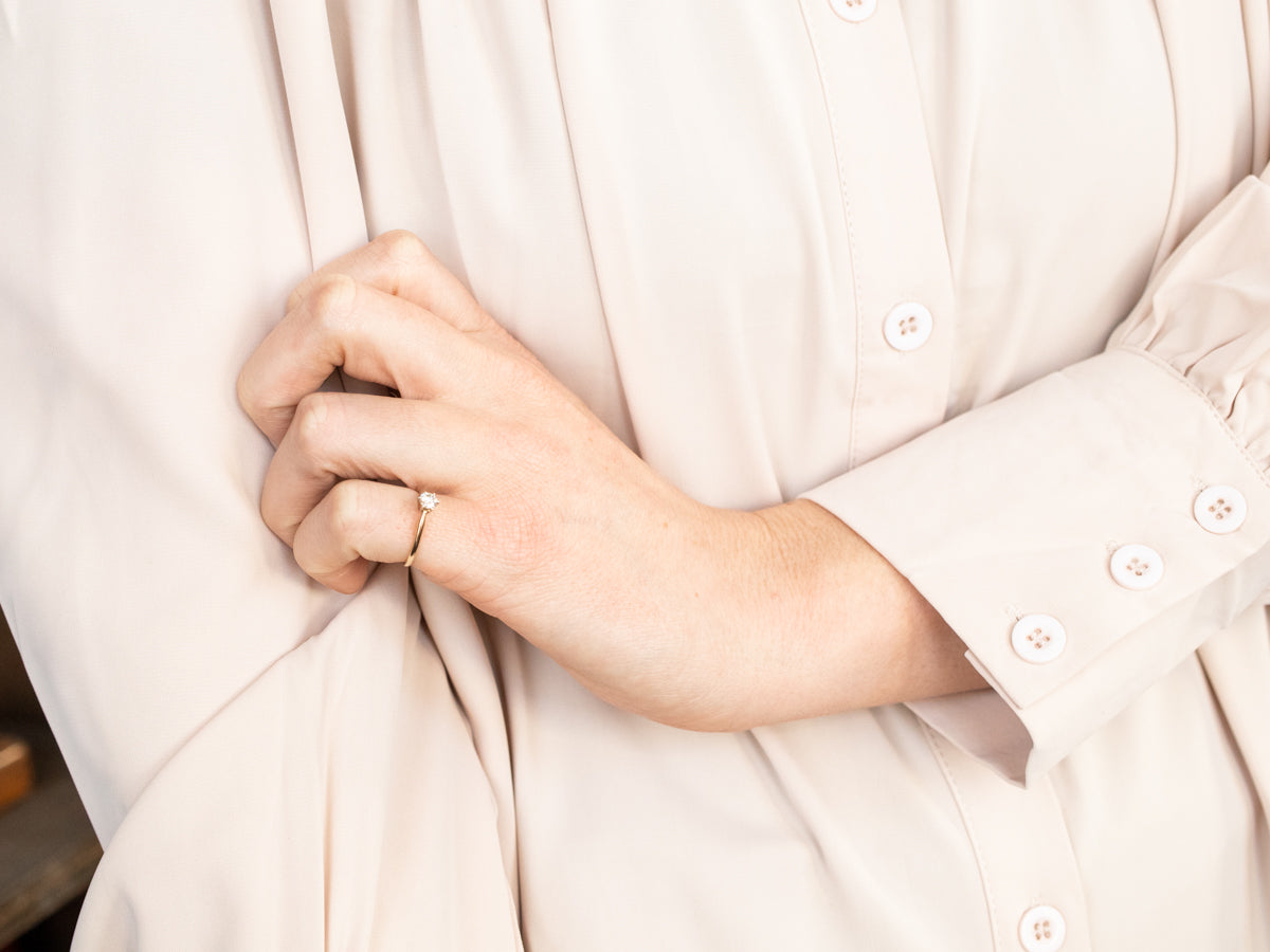 This classic solitaire is well proportioned, with plenty of sparkles, but not a strain on the budget. The bright diamond gleams from the center of a simple six-prong head, while the sleek yellow gold shoulders are polished to perfection!