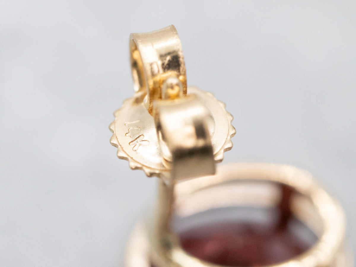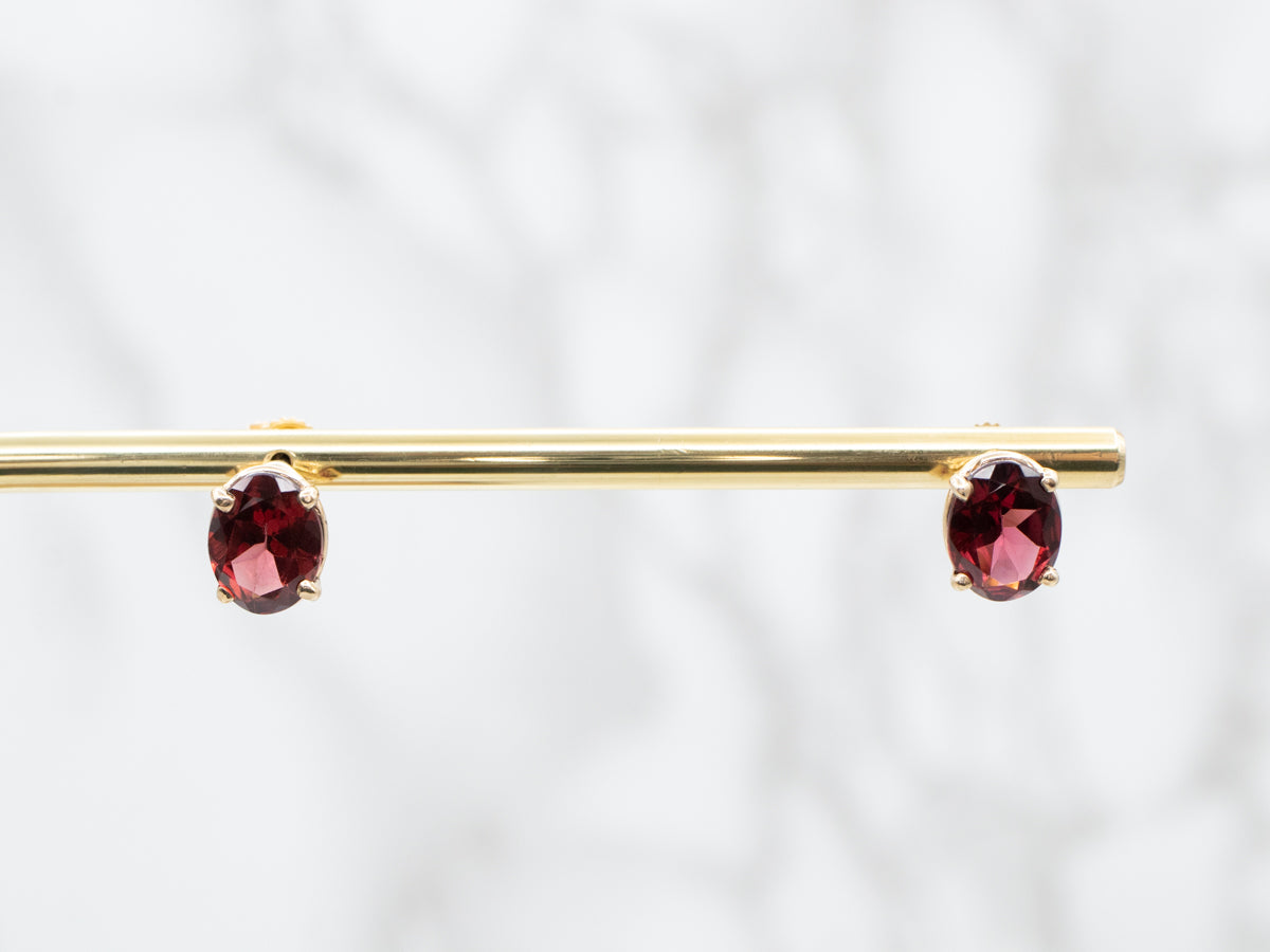 Metal: 14K Yellow Gold Gem: 2 Garnet totaling 3.68 Carats Gem Measurements: 9.0 x 7.1 mm, Oval Earrings Length: 9 mm Earrings Width: 7 mm Marks: “14K” Stamped on the Findings
