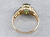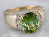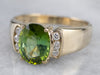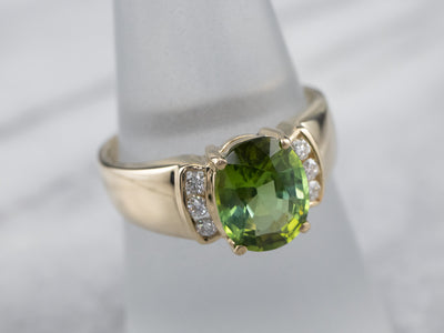 This green tourmaline got some attention when it came through our offices! Perfectly shaded with highlights of olive and kelly, this gemstone is divine! We've set this gem into a vintage unisex gold setting that is a simple but effective frame with diamond accents.