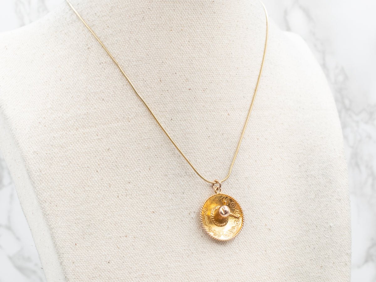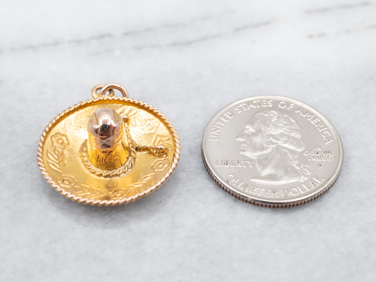 This 14-karat gold charm is yellow, with wonderful etched details in the crease of the brim and crown of the hat!