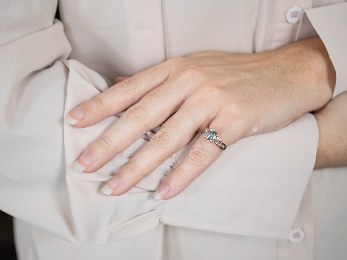 Although generally we only recommend diamonds, sapphires, and rubies as engagement rings, due to their ability to stand up to everyday wear, this ring is an exception! The classic engagement ring style suits this deep, brilliant stone perfectly. The head sits up high enough to protect the stone, without being difficult to wear. This is a beautiful blue zircon, one of the most richly colored stones in our collection.