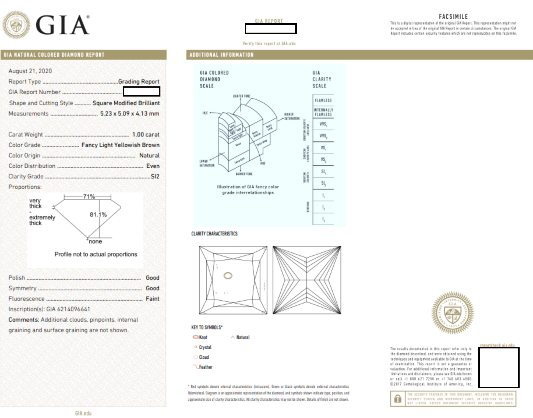 Metal: 14K White Gold Gem: Diamond 1.00 Carats, SI2 in Clarity, Champagne in Color Gem Measurements: 5.2 x 5.0 mm, Princess Cut Accents: 2 Diamonds totaling .36 Carats Ring Size: 5 Marks: "14K" Stamped on the inside band GIA Report Number: 621*********