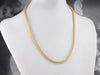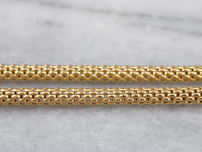 This woven popcorn chain is substantial enough to wear alone, but will also be easy to wear with a pendant. Crafted from 14 karat yellow gold, this lovely chain is comprised of tiny domed links, giving it a great play of light on the skin.