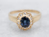 Metal: 14K Yellow Gold Gem: Sapphire Gem Measurements: 5.7 x 4.8 mm, Oval Accents: 10 Diamonds totaling .20 Carats, G in color, VS in Clarity Ring Size: 6.75 Marks: "14K" Stamped on the inside band