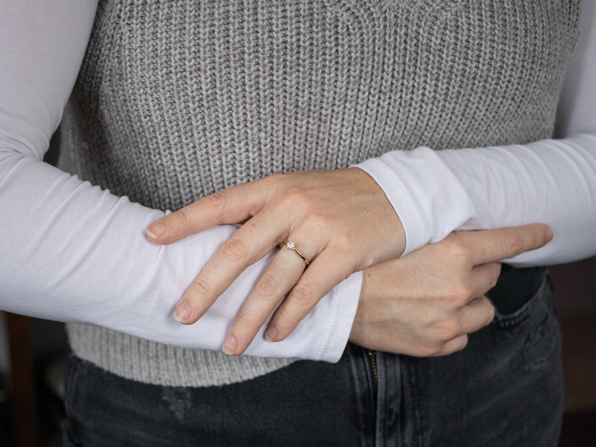 This engagement ring is simple and traditional, with a gently tapered shank and shoulders. This sweet little vintage ring has been restored and updated with a bright and sparkling diamond. Absolutely lovely!