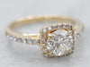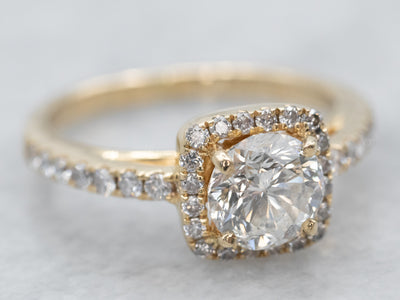 Metal: 14K Yellow Gold Gem: Diamond .70 Carats, I1 in Clarity, J in Color Gem Measurements: 5.5 mm, Round Accents: 34 Diamonds totaling 0.24 Carats, G in Color, SI1 in Clarity Ring Size: 5.50 Marks: "14K" Stamped on the inside band