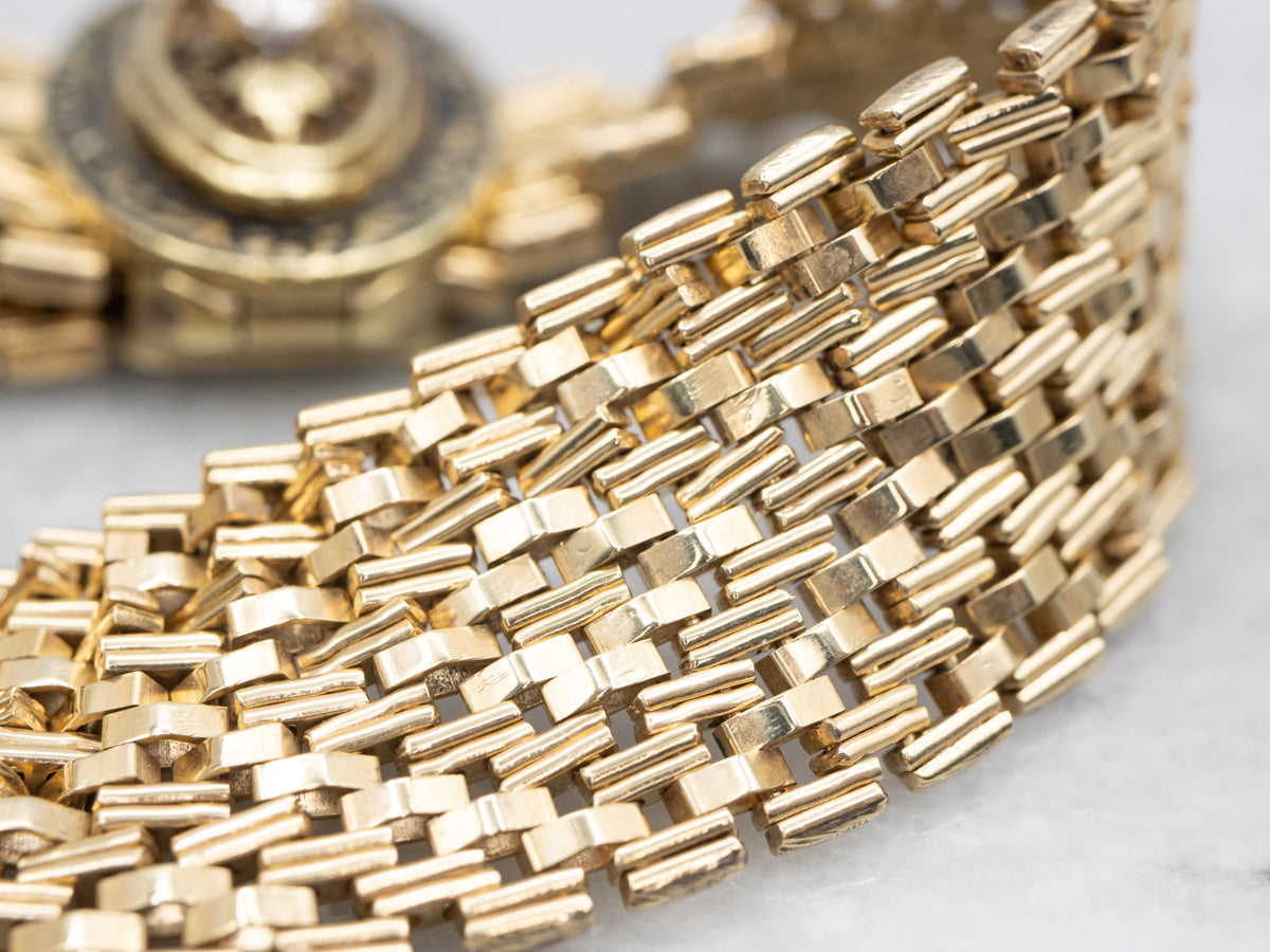 This mesh bracelet is from the Victorian era and comes complete with its original enamel, dating to the late 1800s. It slips over the hand like a bangle and then is adjusted by moving the slide until the fit is comfortable, making it wearable on even a large wrist. We've restored this piece by replacing the center with a new diamond, finished with polished gold tassels. This handsome piece is a true collector's item!