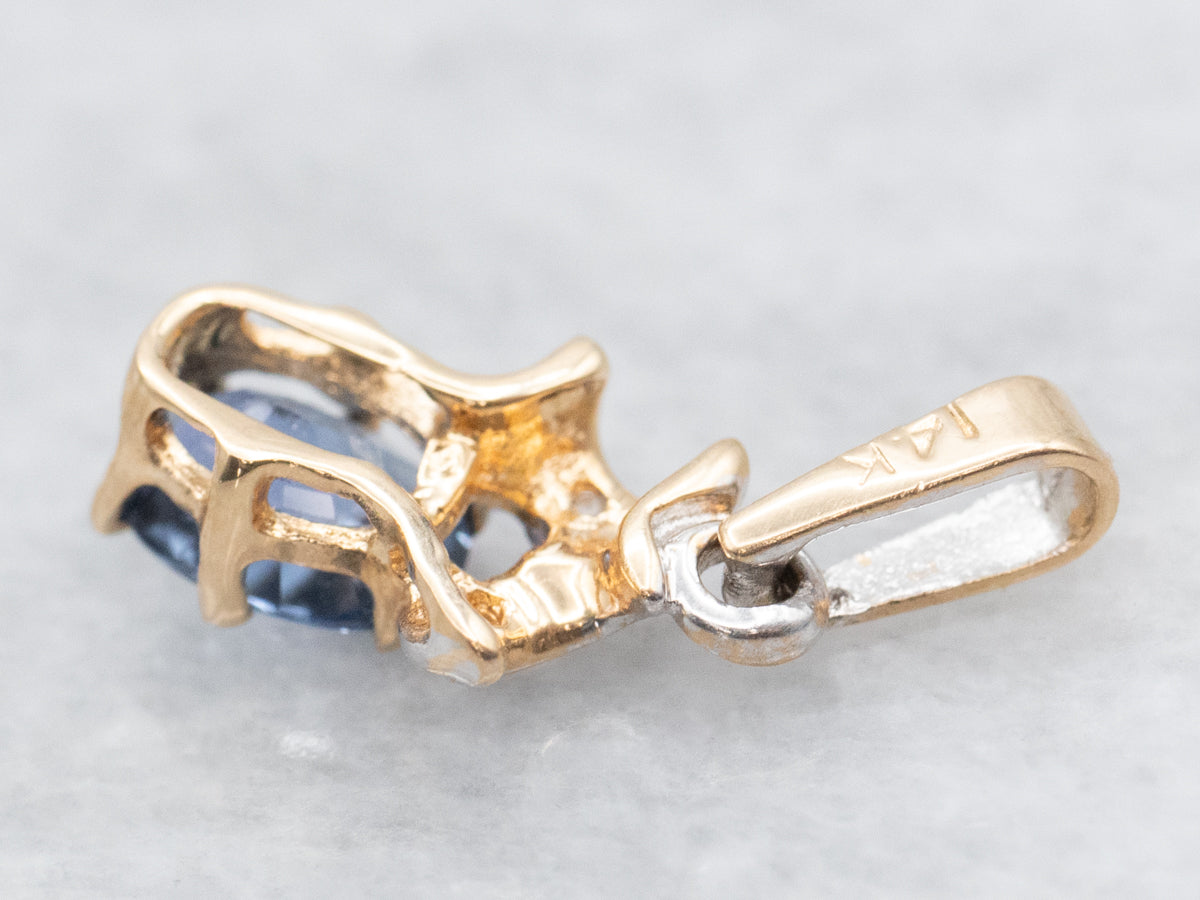 Metal: 14K Yellow Gold Gem: Sapphire .60 Carats Gem Measurements: 5.6 x 3.7 mm, Oval Accents: 2 Diamonds totaling .005 Carats, I in Clarity, I in Color Measurements: 16 x 7 mm, with bail Marks: “14K” Stamped on the reverse