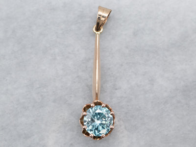 Metal: 14K Yellow Gold Gem: Blue Zircon 1.90 Carats Gem Measurements: 7.3 mm, Round Measurements: 35 x 9 mm, with bail Marks: “14K” Stamped on the reverse
